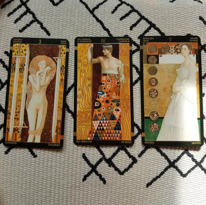 Unlike last week’s reading using the Deviant Moon deck, The Wild Unknown Animal spirit deck, and The Illustrated Herbiary deck, this week we’re going to use the Klimt Tarot. (The cards are gorgeous and very fancy looking.)