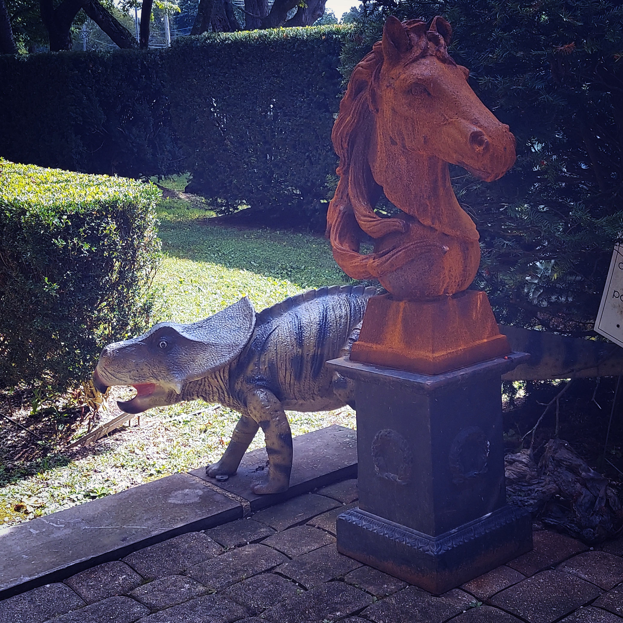 Signs directed us to the Dinosaur Park, which we eagerly followed. They led us past more statuary, into an area populated by large, brightly colored dinosaur statues. They were kept in their own pens made up of neatly trimmed hedges and garden fences, interspersed with large, bright mushrooms, a vintage carousel horse, and a spiraling labyrinth that ended in a gazebo at the center of it all.
