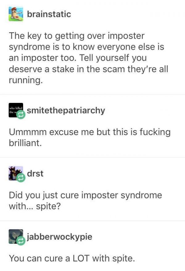 I know a lot of people have imposter syndrome and are probably doing the same thing. However, I am sure that they pale in comparison to my level of utter charlatanry.