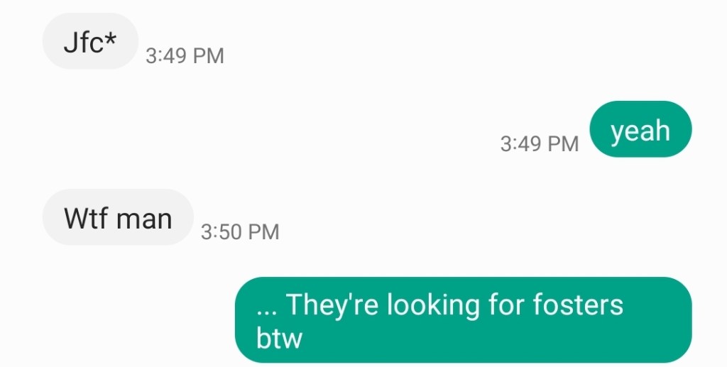(Also, I was maybe kind of hoping I could tug on a few heartstrings and get him to agree to try to foster.)