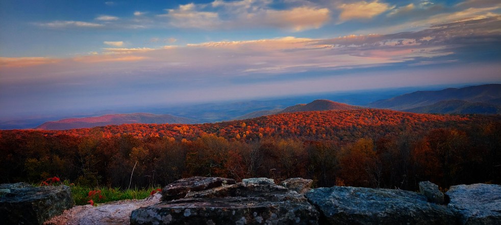 We took a road trip down Skyline drive to go leaf snarping. It was unseasonably warm, but the elevation made it quite a bit cooler. The leaves were brilliant, and the air was full of the earthy, musky, spicy-sweet smell of decomposing foliage. The strange bit of warm weather we’ve had meant that there were still some wildflowers clinging to life, bringing even more color to the already-saturated landscape. It was near sunset, so the nearly-full moon was shining just above a bank of bright pink clouds. The landscape looked like a Klee painting, the sky was a vaporwave album, and the air was filled with a smell a perfumer could only dream of replicating.